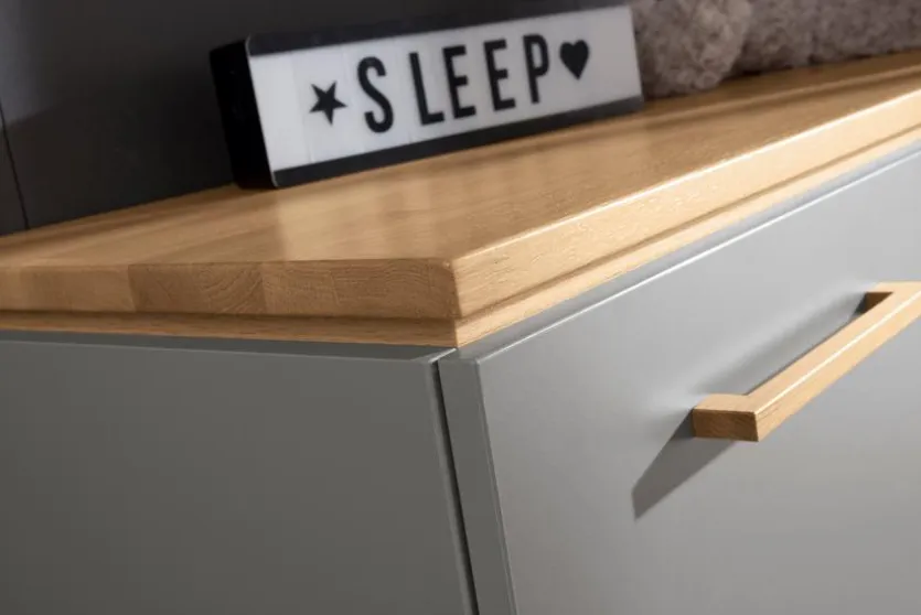 - Sockel, Abdeckplatte und Griffe aus massiver Eiche