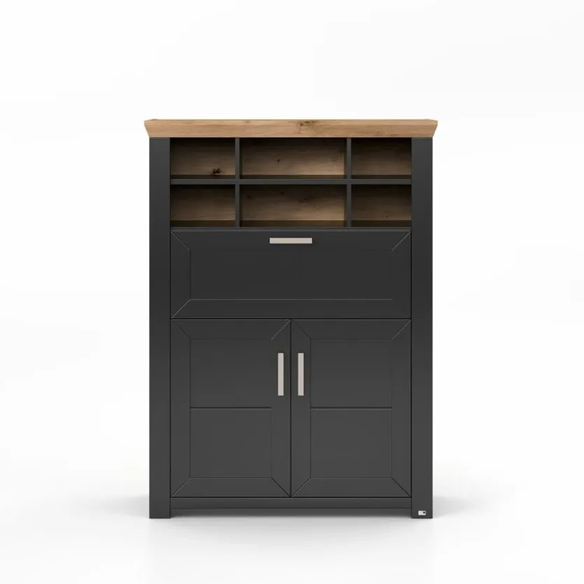 - Front aus Holzwerkstoff (MDF) in Graphit, Korpus aus Spanplatte mit kratzfester Melaminharzfolie in Graphit, Absetzung in Artisan Eiche Dekor