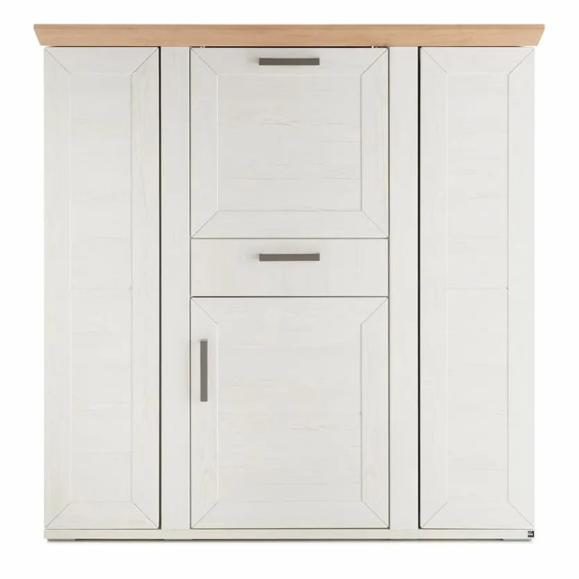 - Korpus aus Holzwerkstoff (Spanplatte) mit kratzfester Melaminharzfolie in Pino-Aurelio, Front aus Holzwerkstoff (MDF) in Pino-Aurelio, Absetzung in Eiche Artisan