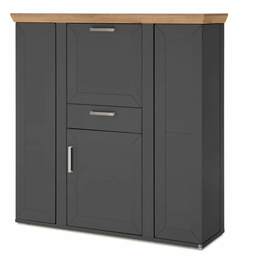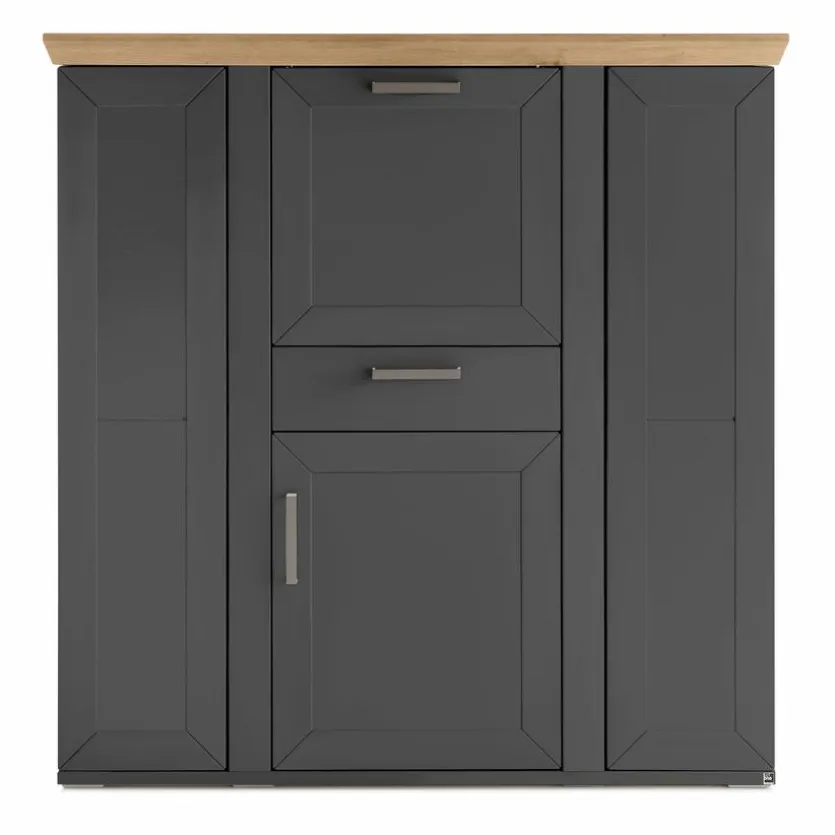 - Korpus aus Holzwerkstoff (Spanplatte) mit kratzfester Melaminharzfolie in Graphite, Front aus Holzwerkstoff (MDF) in Graphite, Absetzung in Eiche Artisan