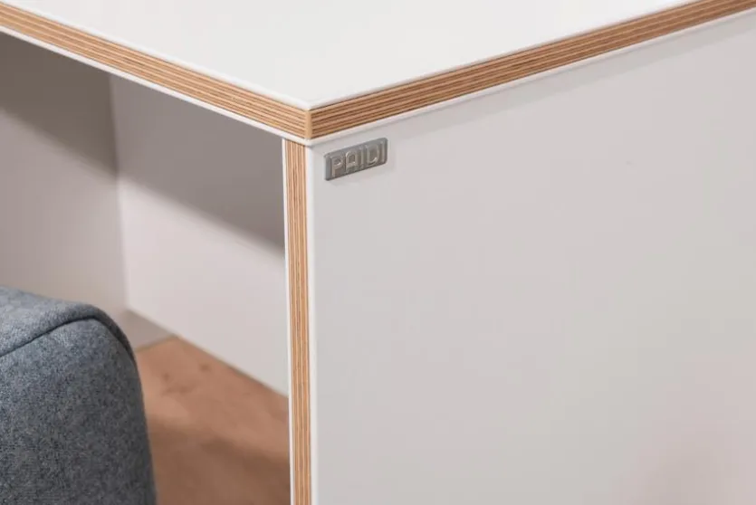 - Aus Holzwerkstoff mit kratzfester Melaminharzfolie in weiß mit Multiplexkante (Kante bestehend aus mehreren Furnierlagen)
