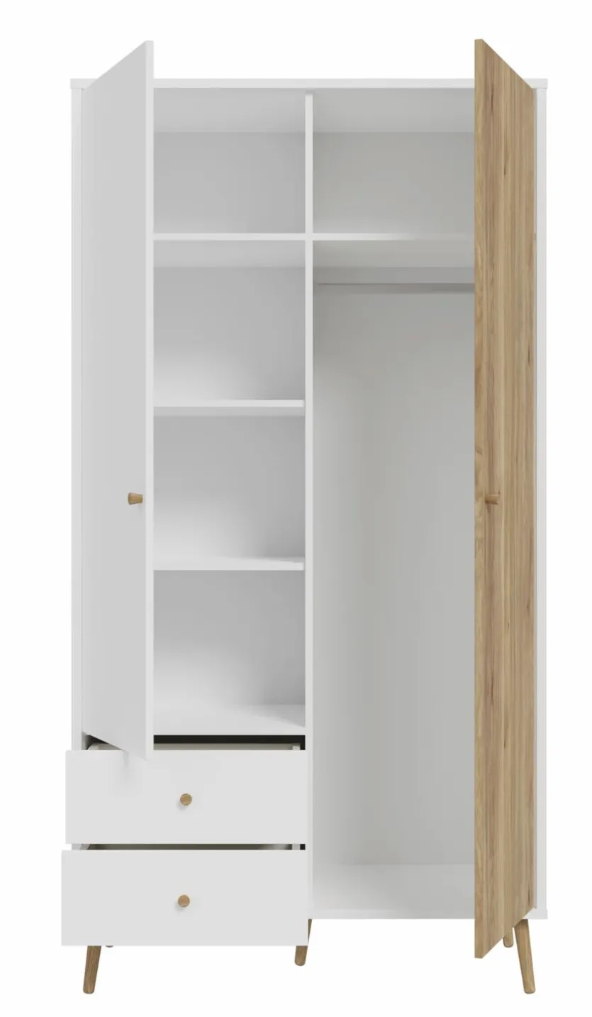 - Mit 2 Türen, 2 Schubkästen, 4 Böden und 1 Kleiderstange