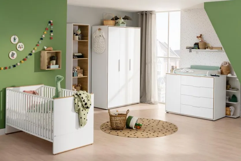 - Aus Holzwerkstoff (Spanplatte) mit kratzfester Melaminharzfolie in Kreideweiß, Innenkorpus und Einlegeböden aus Holzwerkstoff (Spanplatte) mit kratzfester Melaminharzfolie in Eiche-Montana-Nachbildung