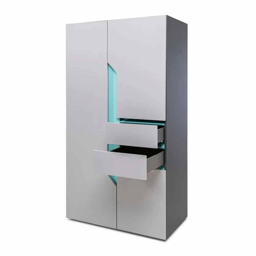 - Korpus aus Holzwerkstoff (Spanpatte) mit kratzfester Melaminharzfolie in Schiefergrau, Front aus Holzwerkstoff (Spanpatte) mit kratzfester Melaminharzfolie in Hellgrau, Absetzung aus Holzwerkstoff (Spanplatte) mit Lack in Türkis
