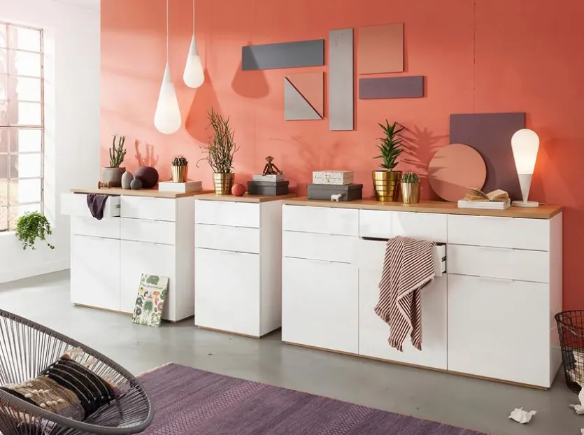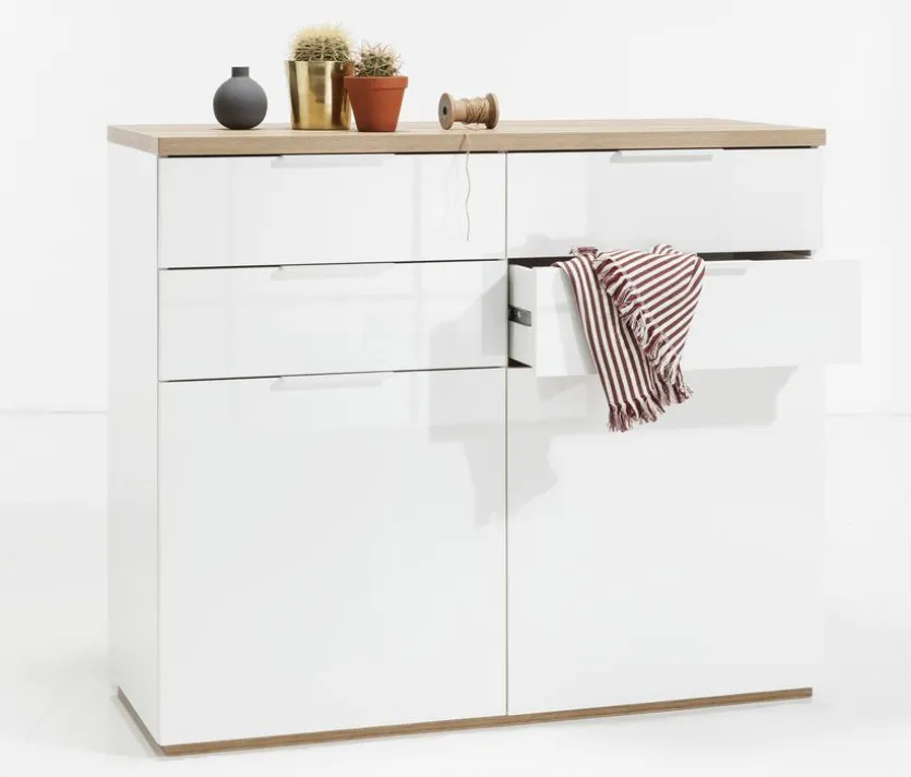 Die Kommode Mundi der Marke Composad ist nicht nur funktionell, sondern ein echtes Designerstück. Mit der weißen Hochglanzlackierung und der kontrastierenden Abdeckplatte erhält das Möbel ein attraktives und modernes Design. Darüber hinaus bietet die Kommode Mundi von Composad viel Stauraum für verschiedene kleinere Gegenstände.