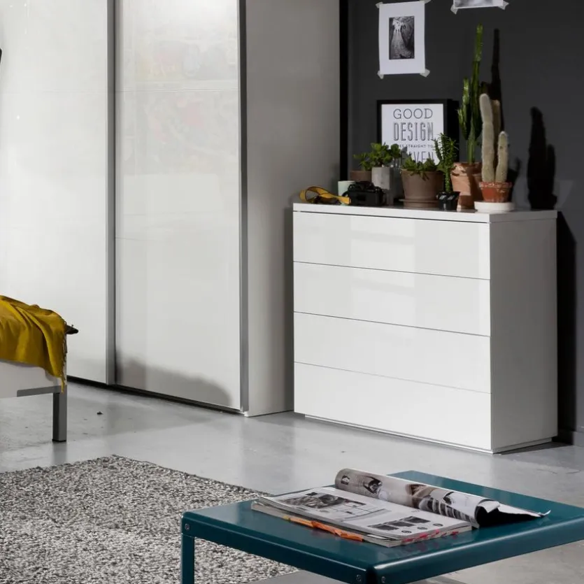 Die Kommode Privilegio ist dezent gestaltet und ermöglicht daher ein vielseitiges Kombinieren mit anderen Möbelstücken. Zur Ausstattung des Einrichtungsgegenstandes zählen vier Schubkästen, in denen allerlei Kleinigkeiten bequem Platz finden. Als zusätzliche Ablagefläche kann die Oberseite der Kommode Privilegio verwendet werden. Hier können hübsche Vasen oder liebgewonnene Familienfotos präsentiert werden.