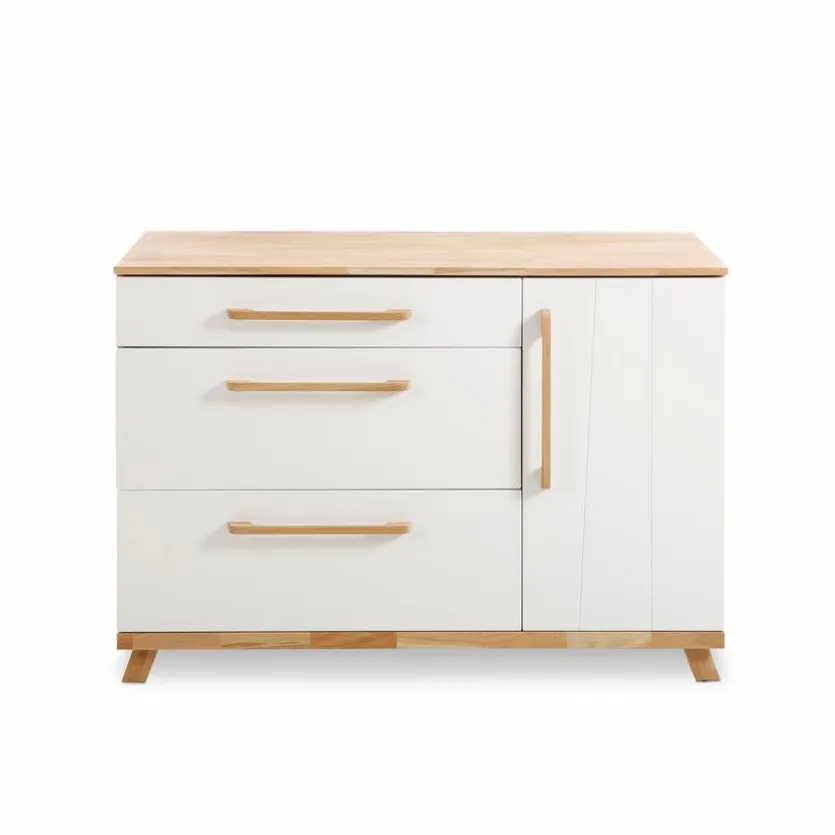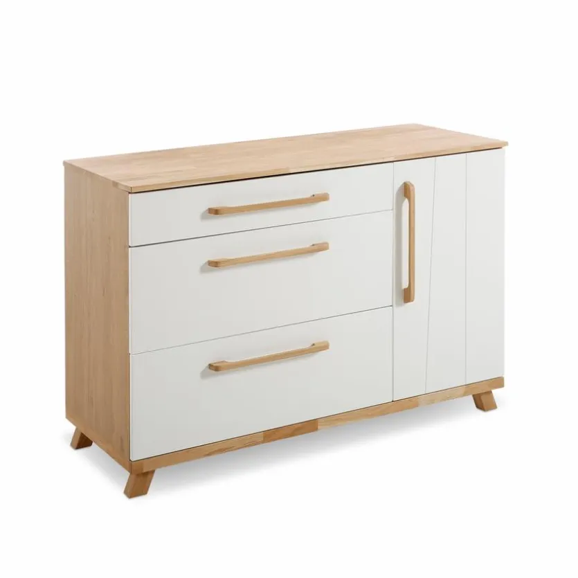 - Front aus Holzwerktstoff (MDF) in Weiß lackiert; Deckplatte, Fußrahmen und Füße aus massiver Eiche