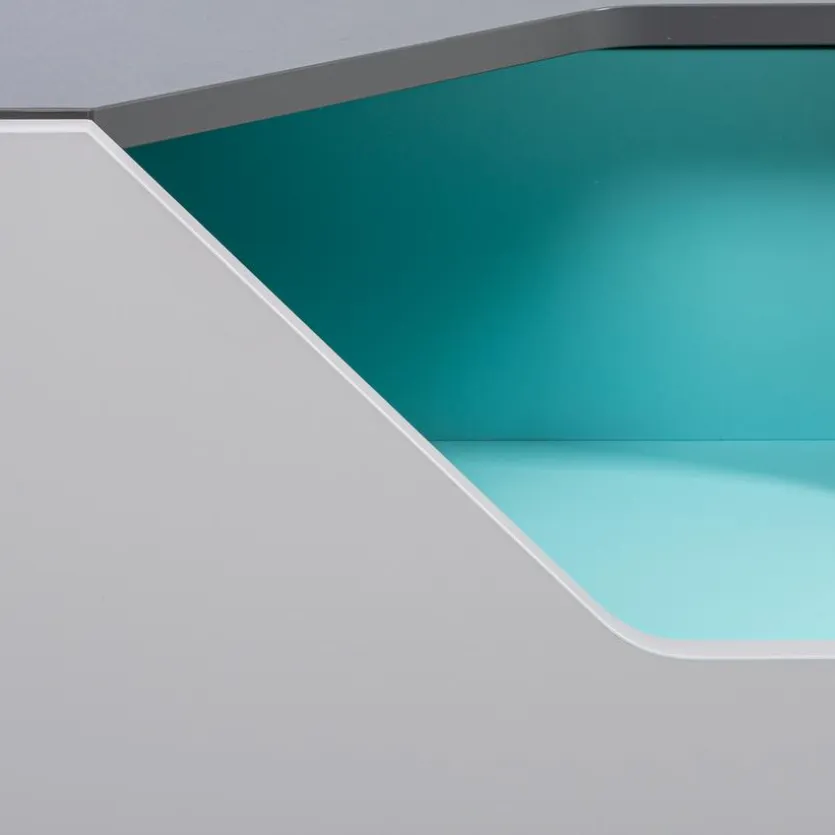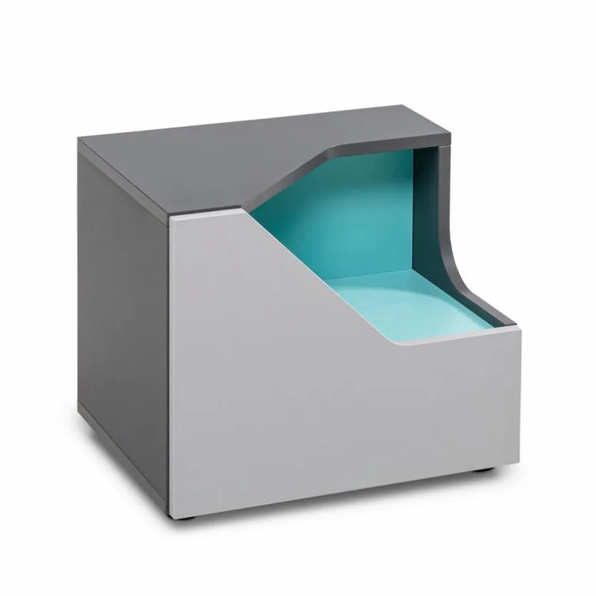 - Korpus aus Holzwerkstoff (Spanpatte) mit kratzfester Melaminharzfolie in Schiefergrau, Front aus Holzwerkstoff (Spanpatte) mit kratzfester Melaminharzfolie in Hellgrau, Absetzung aus Holzwerkstoff (Spanplatte) mit Lack in Türkis