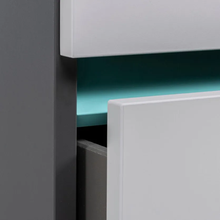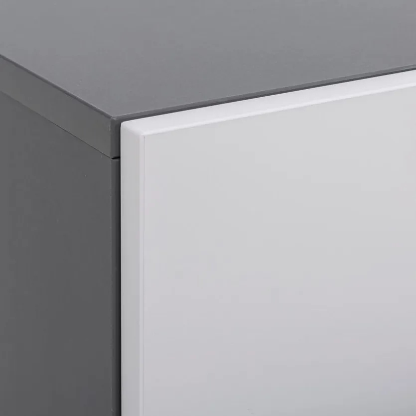 - Korpus aus Holzwerkstoff (Spanpatte) mit kratzfester Melaminharzfolie in Schiefergrau, Front aus Holzwerkstoff (Spanpatte) mit kratzfester Melaminharzfolie in Hellgrau, Absetzung aus Holzwerkstoff (Spanplatte) mit Lack in Türkis