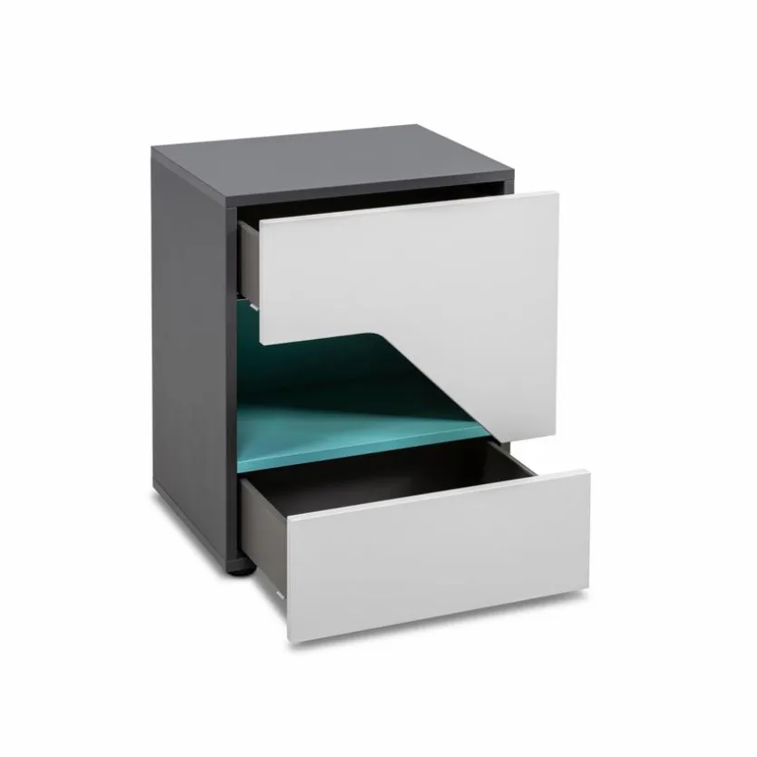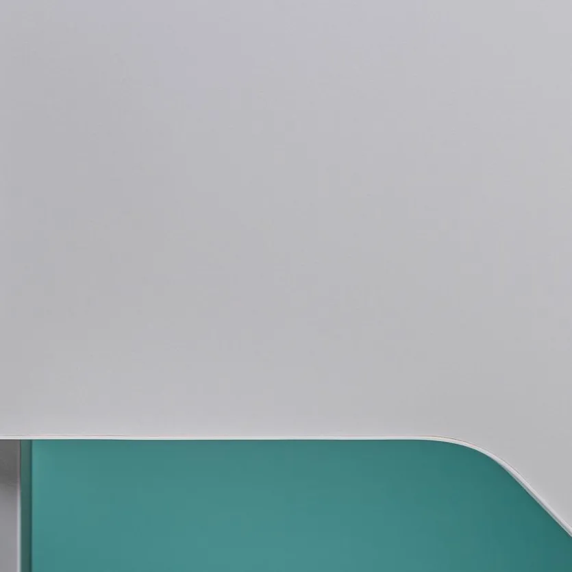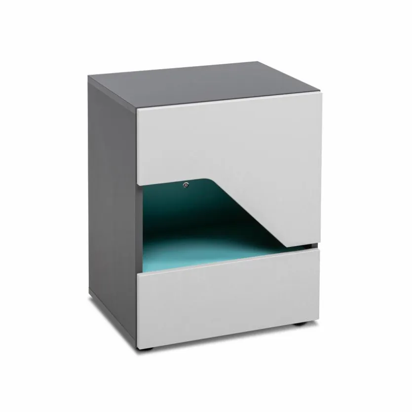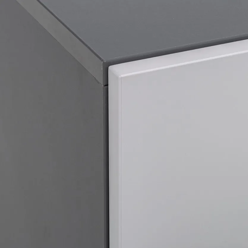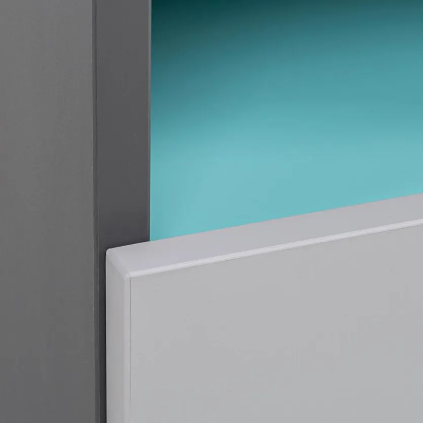 - Korpus aus Holzwerkstoff (Spanpatte) mit kratzfester Melaminharzfolie in Schiefergrau, Front aus Holzwerkstoff (Spanpatte) mit kratzfester Melaminharzfolie in Hellgrau, Absetzung aus Holzwerkstoff (Spanplatte) mit Lack in Türkis