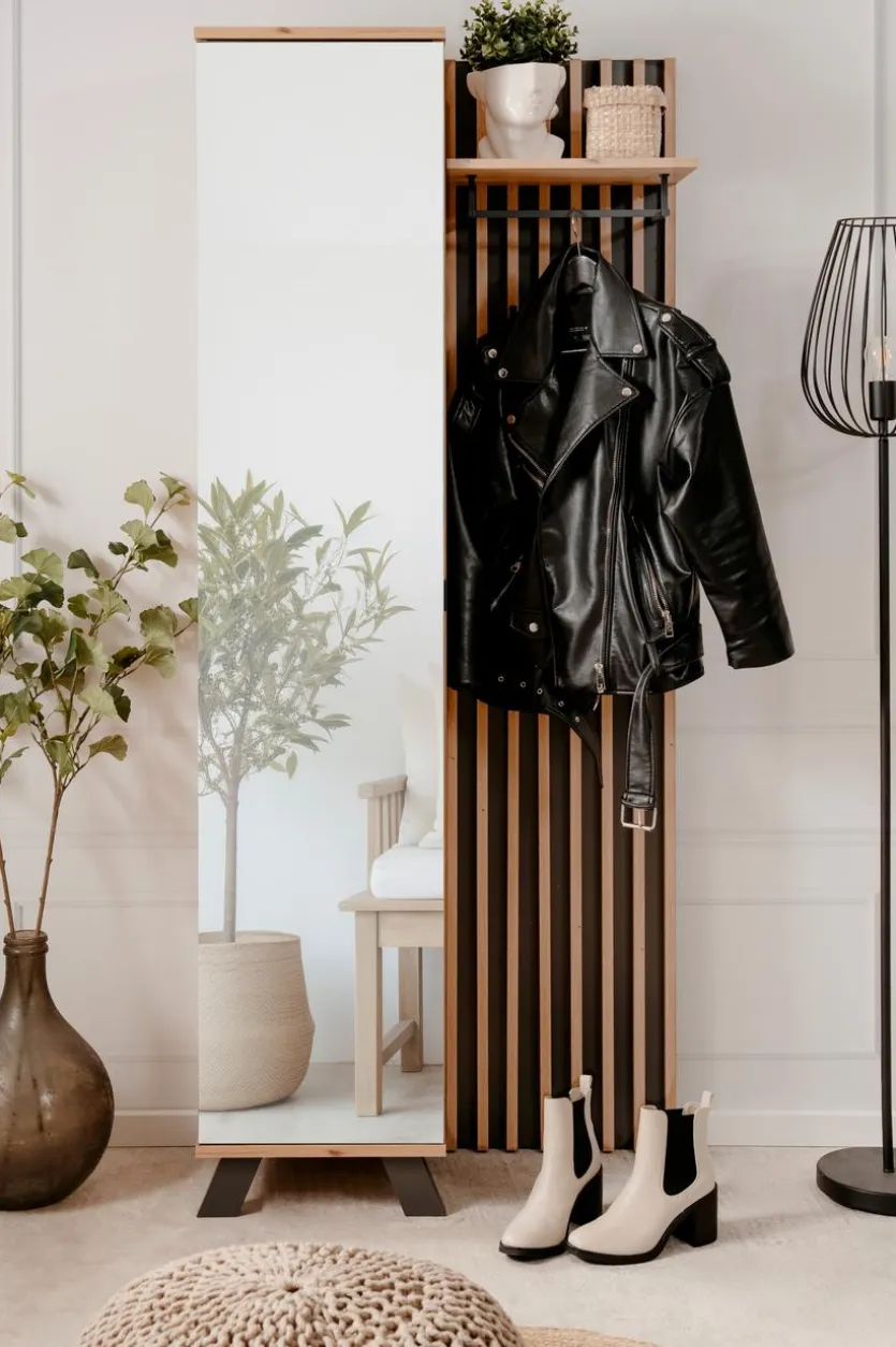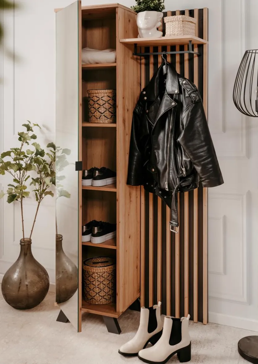 Die Kompaktgarderobe Medan verkörpert modernen Chic und überzeugt in puncto Funktionalität. Klar gezeichnete Konturen, eine große Fläche in Lamellenoptik und eine verspiegelte Front bestimmen den eindrucksvollen Look dieser Gaderobe. Dank des Schrankelements mit praktischen Einlegefächern wartet die Kompaktgarderobe Medan zudem noch mit jeder Menge Stauraum für Fashion-Accessoires, Schuhe und mehr auf.