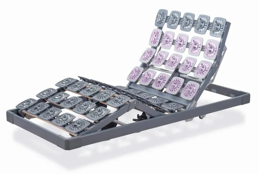 - Federelemente mit mittlerer Festigkeit im Lordose- und Beckenbereich, um die größere Belastung aufzunehmen, mit individuell fixierbarer Schulterabsenkung