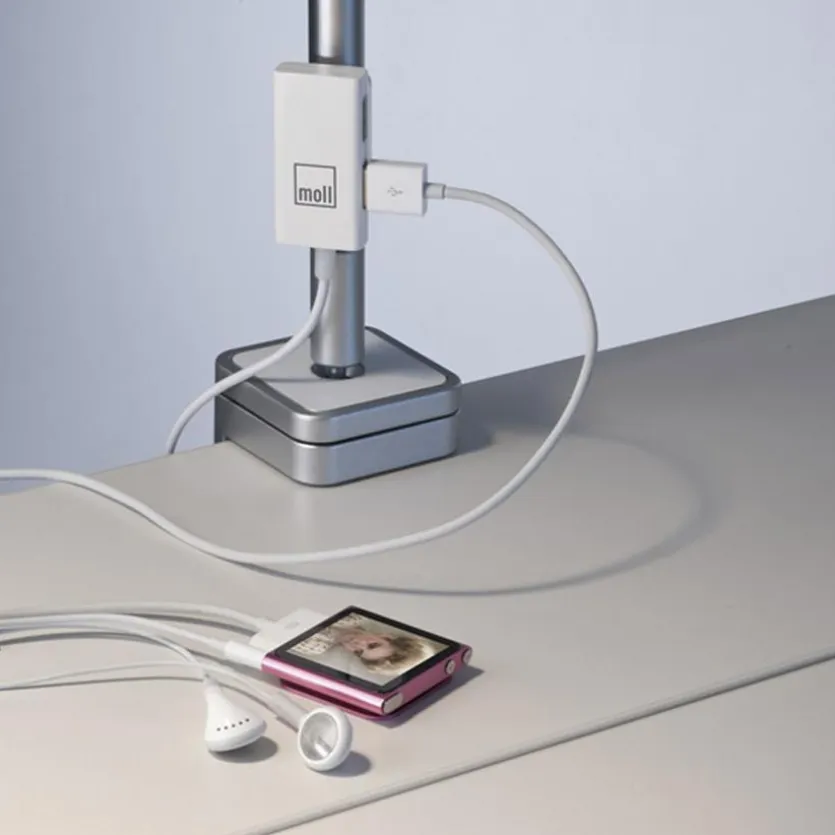Oft ist die Schreibtischbeleuchtung zu hell oder zu dunkel. Die Schreibtischlampe Flexlight von Moll schafft Abhilfe bei diesem Problem. Die flexible LED-Schreibtischleuchte besitzt einen verstellbaren Hals, mit dem der Winkel und Abstand zur beleuchteten Oberfläche beliebig variiert und der Grad der Ausleuchtung bestimmt werden können. Somit ermöglicht die dimmbare Lampe sowohl punktuelles Arbeiten als auch Sortierarbeiten auf dem gesamten Schreibtisch.