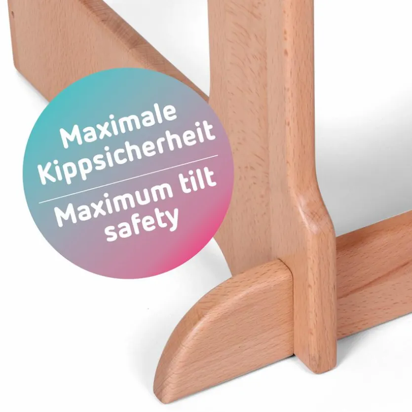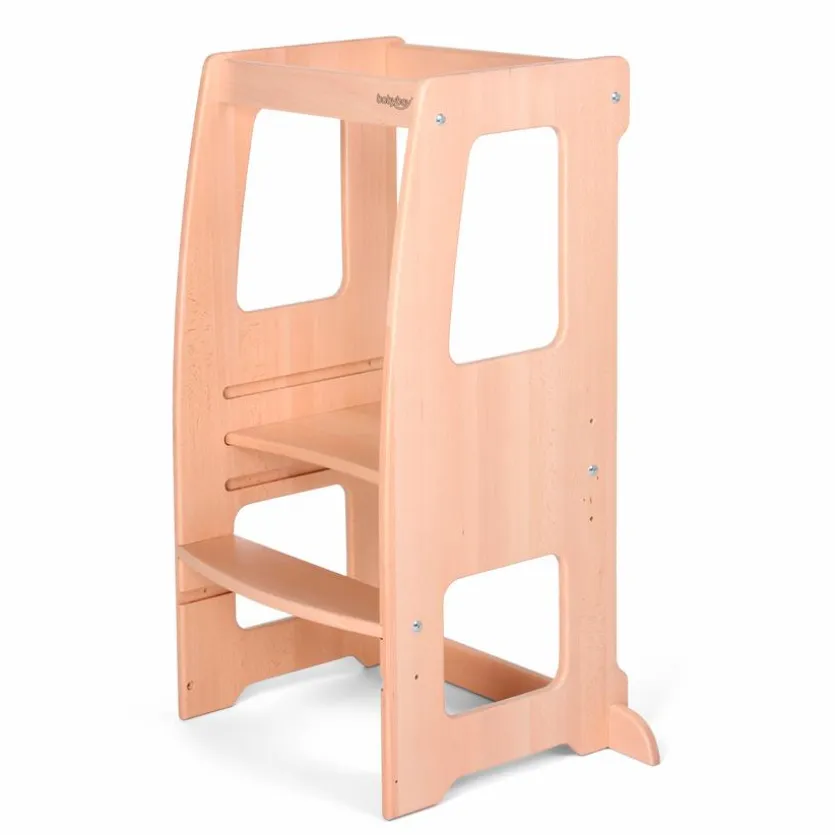 - Mitwachsend – Lernturm mit 3-fach höhenverstellbarer Fußplatte und 2-fach höhenverstellbarer Einstiegsstufe