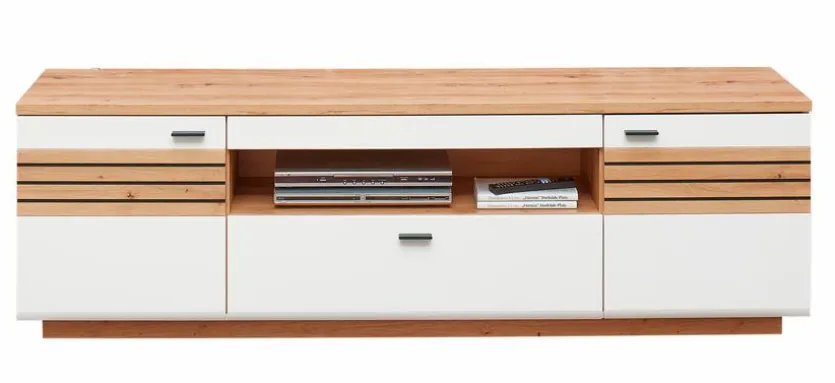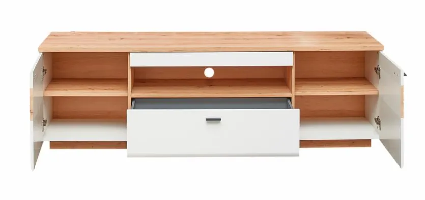 - Bestehend aus: 2 Holztüren, 1 offenes Fach, 1 Schubkasten