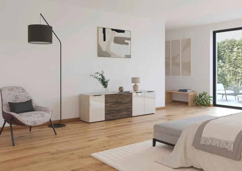 - Korpus aus Holzwerkstoff (Spanplatte) mit hochwertigem Dekor-Druck in Champagner