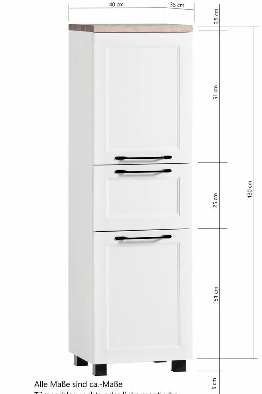 - Mit 2 Türen mit je 1 Einlegeboden (Belastbarkeit E-Boden bis max. 5kg), 1 Auszug mit Softclose-Funktion und 1 Abdeckplatte in aus Holzwerkstoff (MDF) mit hochwertiger Dekorfolie in Wotaneiche