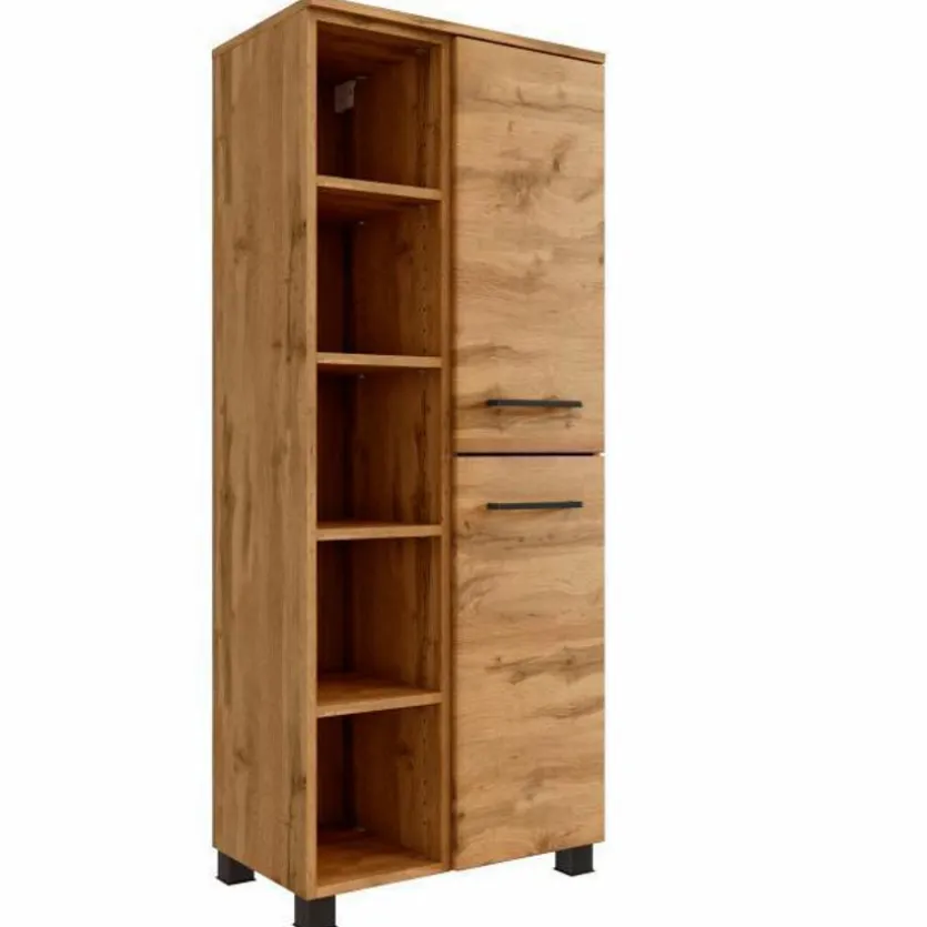 Wenn Sie Ihre Badezimmer optimal ausnutzen wollen, verwenden Sie den Midischrank Manchester der Marke Held-Möbel! Auf den fünf offenen Fächern können Sie zusammengefaltete Frottiertücher lagern, die Sie bei Bedarf sofort griffbereit haben. Der Midischrank Manchester verfügt zudem über zwei Türen. Hinter diesen befinden sich zwei flexible Einlegebögen, damit Sie in der Lage sind, das Möbel an Ihre Bedürfnisse anzupassen.