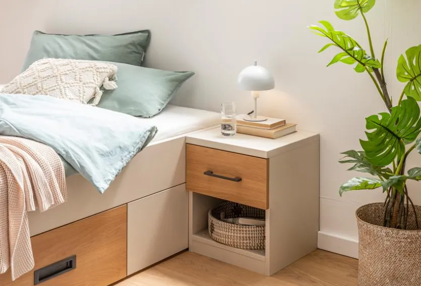 Der Nachttisch Basic ist nicht nur praktisch, sondern bereichert Ihr Zuhause auch in puncto Optik. Puristische Formen und der gelungene Kontrast zwischen dem lackierten Korpus und der Naturholzfront verleihen der Nachtkonsole ein attraktives Äußeres. Zudem hält der Nachttisch Basic im Inneren Ihre wichtigsten kleinere Gegenstände stets griffbereit.