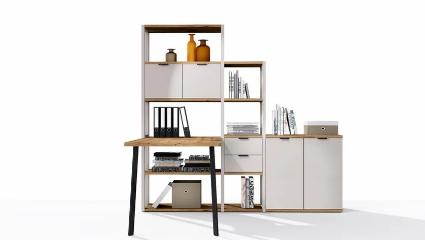 - Bestehend aus: Regalrahmen, Regalböden, Einsätze, Kommode und Schreibtisch