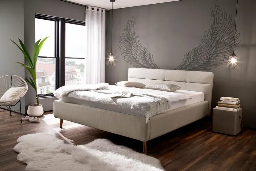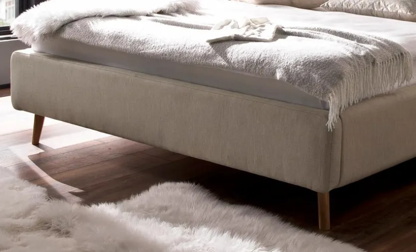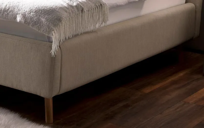 - Bettgestell aus Spanplatte mit Stoffbezug in beige