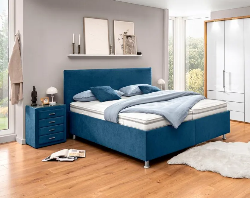 - Bettgestell aus Spanplatte bezogen in Stoff Blau