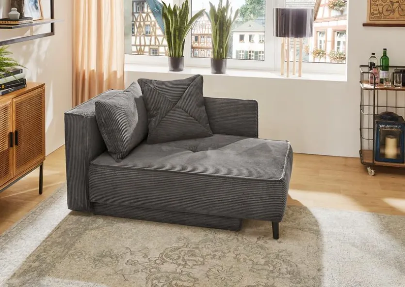 - Inkl. Schlaffunktion durch umklappbare Rückenlehne und Bettkasten