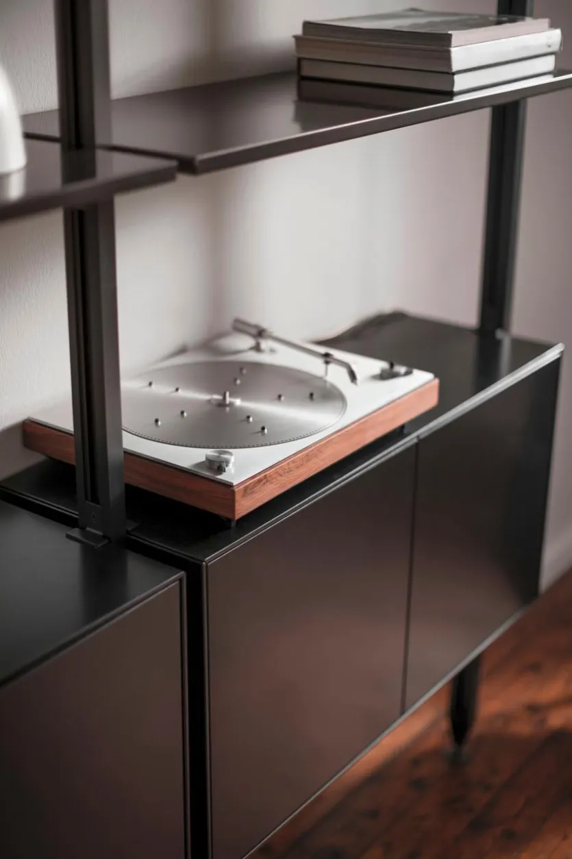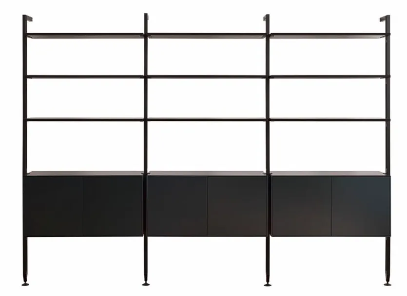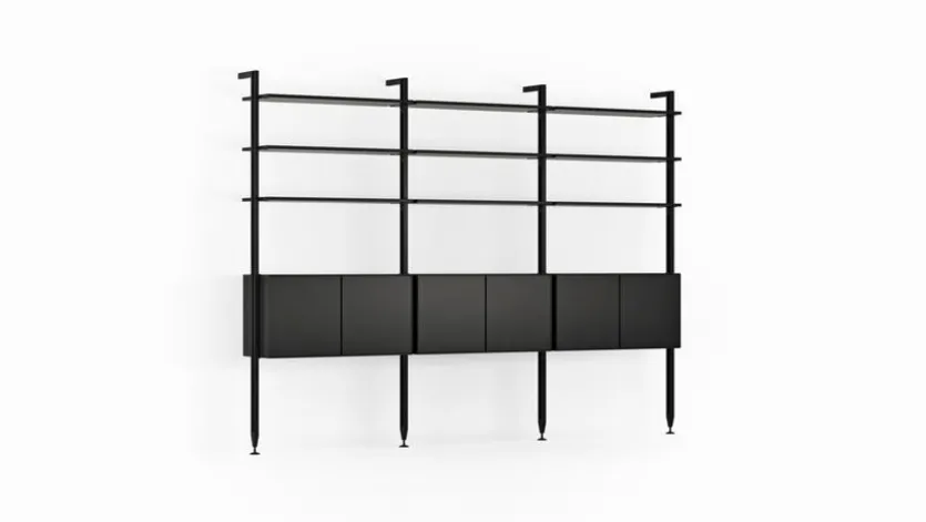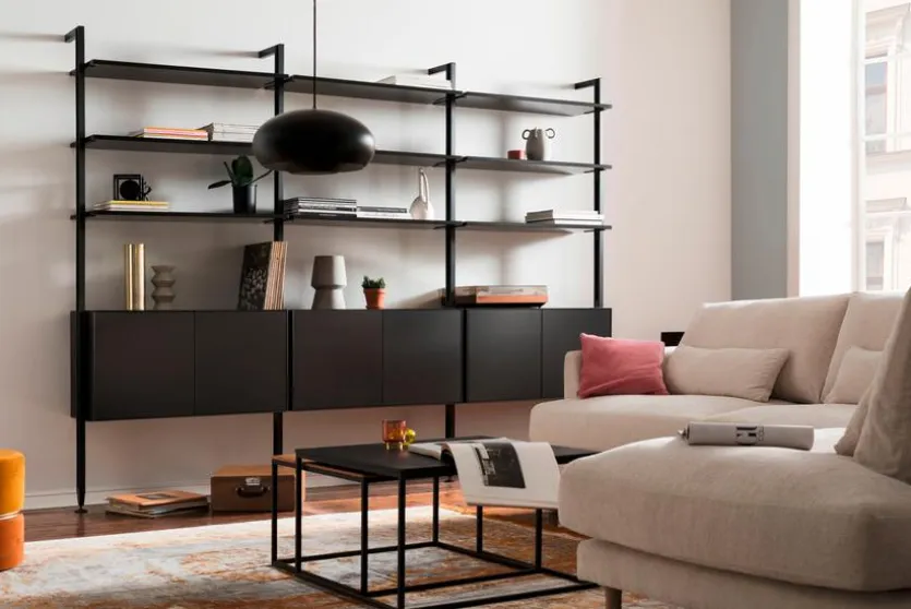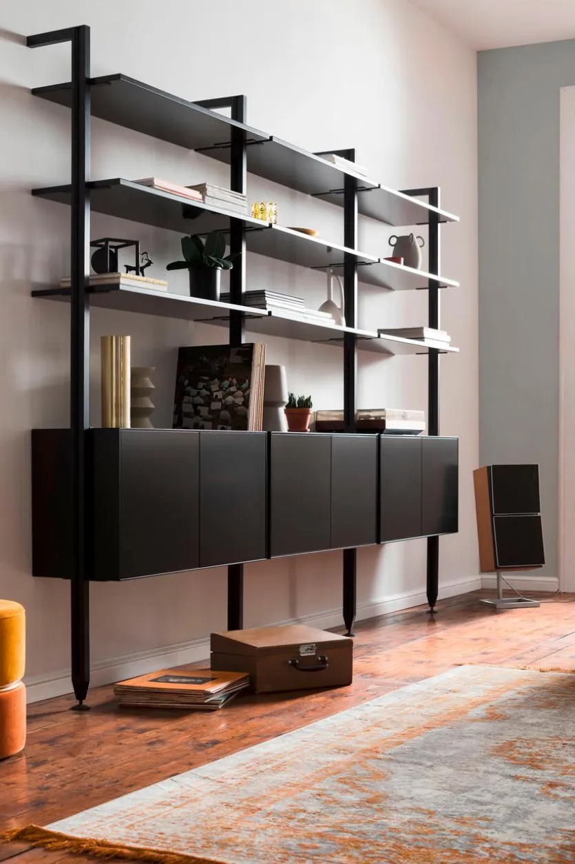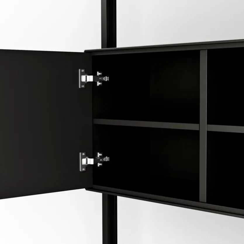 - Gestell aus pulverbeschichtetem Metall in schwarz, Korpus und Fronten aus Holzwerkstoff (MDF) mit Lack in schwarz