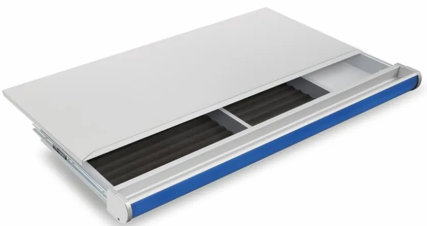 Wunderbar praktisch: Die Riesenschublade Winner von Moll ist die perfekte Ablage für Stifte, Unterlagen & Co. Der leichtgängige Schubkasten mit hochwertiger Aluminiumfront ist auf den Schreibtisch der gleichnamigen Serien abgestimmt und ergänzt diesen um den nötigen Stauraum.