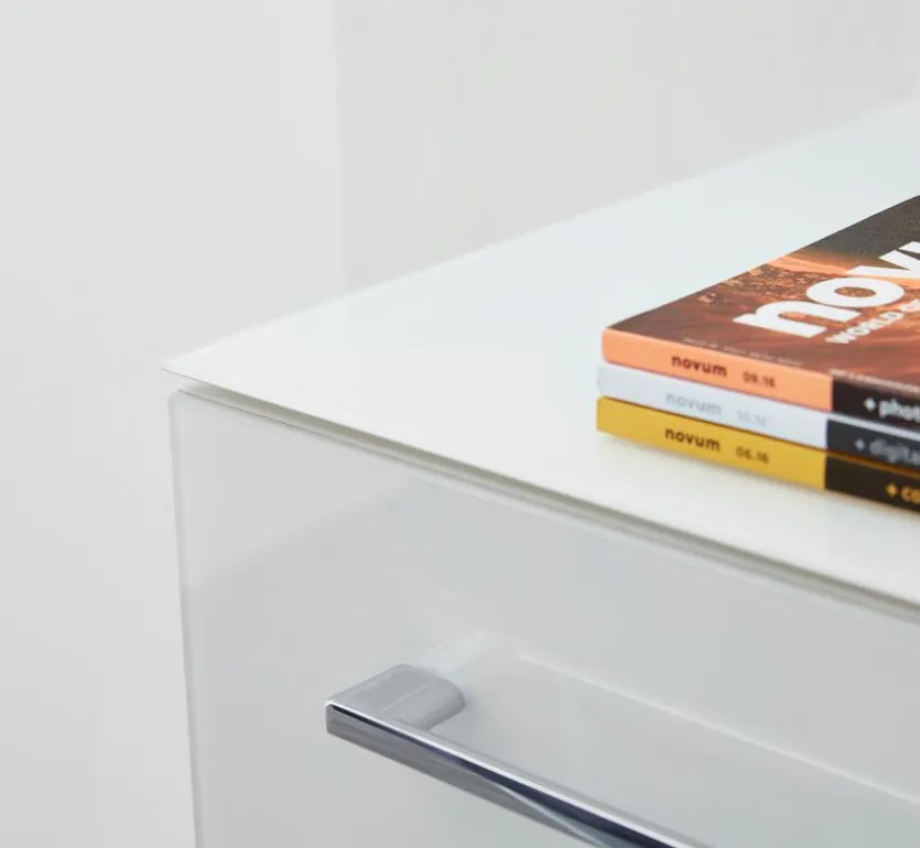 - Korpus aus Spanplatte mit kratzfester Melaminharzfolie in weiß, Deckplatte und Front mit Glasauflagen aus Sicherheitsglas in weiß