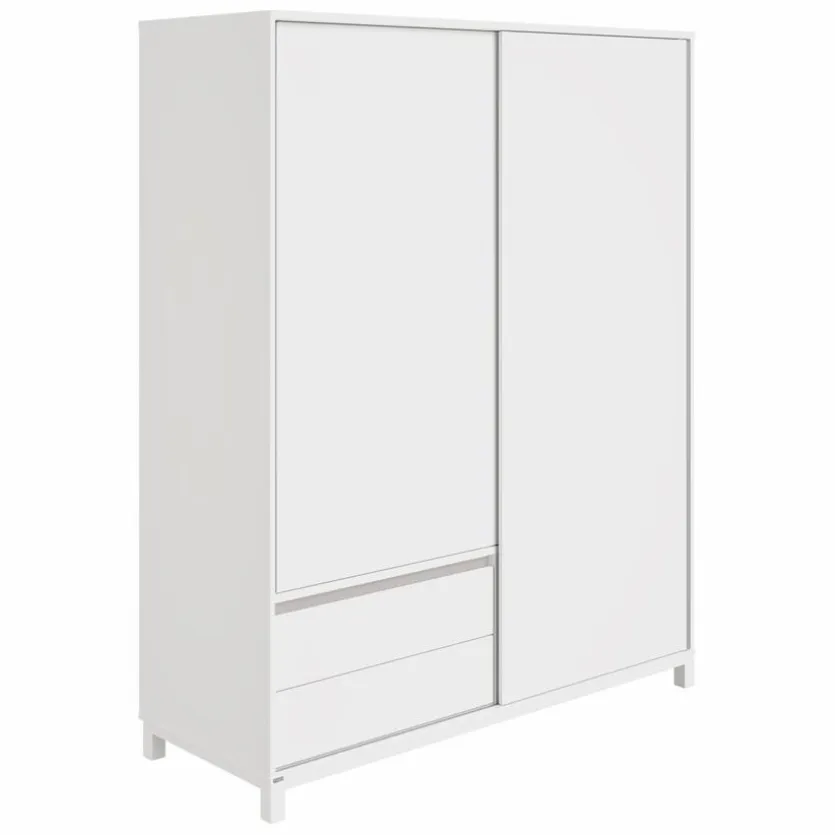- Mit 2 Schiebetüren, 2 Schubkästen, 1 offener Schubkasten, 6 schmale Einlegeböoden, 1 breiten Einlegeboden und 2 Kleiderstangen