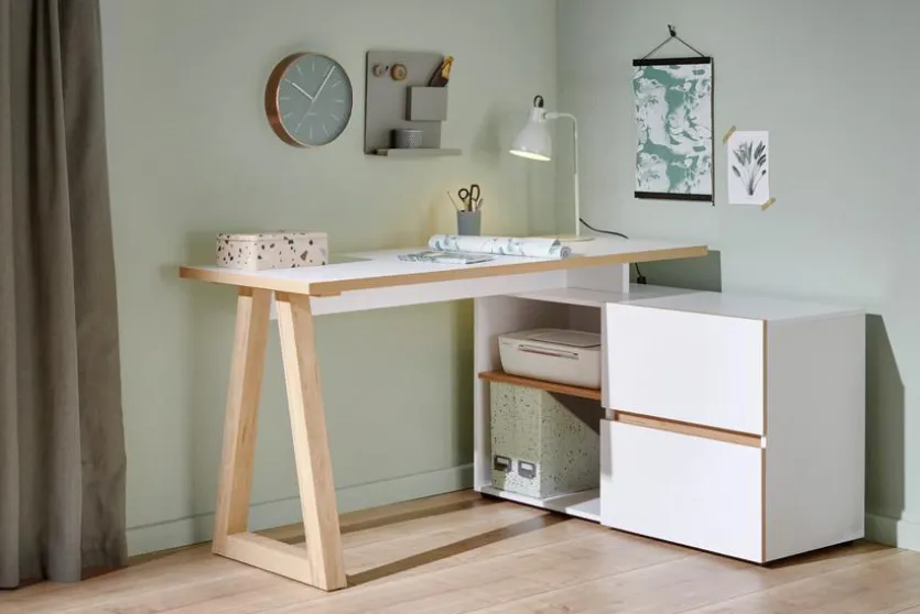 - Aus Spanplatte mit kratzfester Melaminharzfolie in weiß, Gestell und Absetzungen in Kerneiche Nachbildung