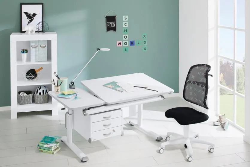 - Aus Spanplatte mit kratzfester Melaminharzfolie in kreideweiß, Gestell, Ablagemulde und Taschenhaken aus Kunstoff in weiß