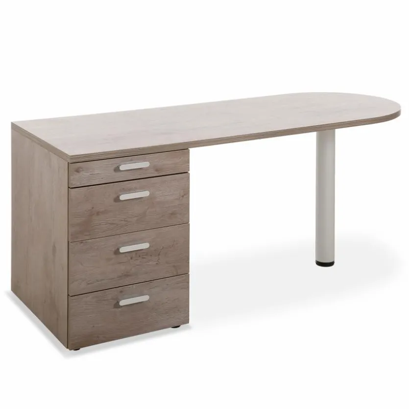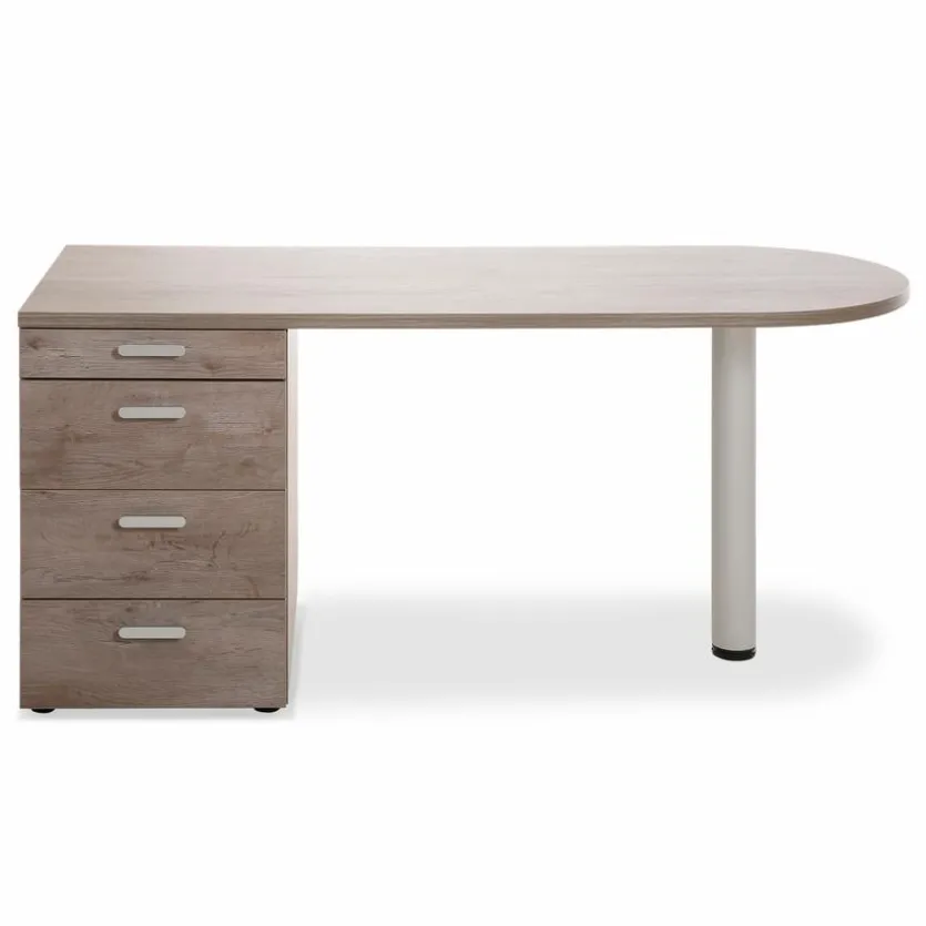 Mit seinen Oberflächen in Steineiche-Nachbildung und den modernen Formen steht der Schreibtisch MAX-I aus dem Hause Rudolf sowohl für Gemütlichkeit als auch für zeitgemäße Eleganz. Ein auffälliges Merkmal, mit dem der Schreibtisch MAX-I von Rudolf aufwartet, ist die mit einem runden Fuß versehene in einem Halbrund endende Platte.