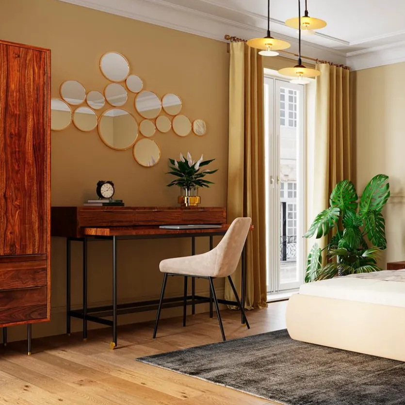 - Rückwand aus Holzwerkstoff (MDF), Füße und Griffe aus Stahl in pulverbeschichtet schwarz mit Absetzungen in messingfarbig