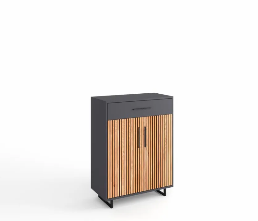Als kompakte und dabei stilvolle Stauraummöglichkeit überzeugt die Schuhkommode Stella von Elfo auf ganzer Linie. Der hochwertige Schuhschrank ist mit einer Schublade sowie mit einem Einlegeboden ausgestattet, der sich hinter zwei Türen mit Kunststoffgriffen verbirgt. Metallkufen verleihen der Schuhkommode Stella eine moderne, luftige Note.