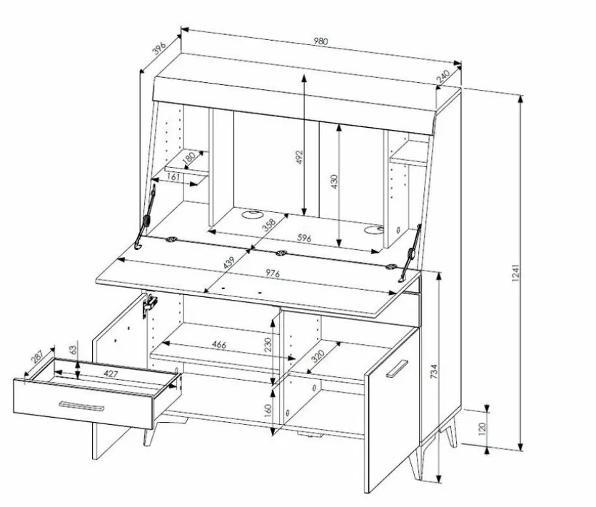 - Mit 1 Klappe, 2 Schubkästen und 2 Türen