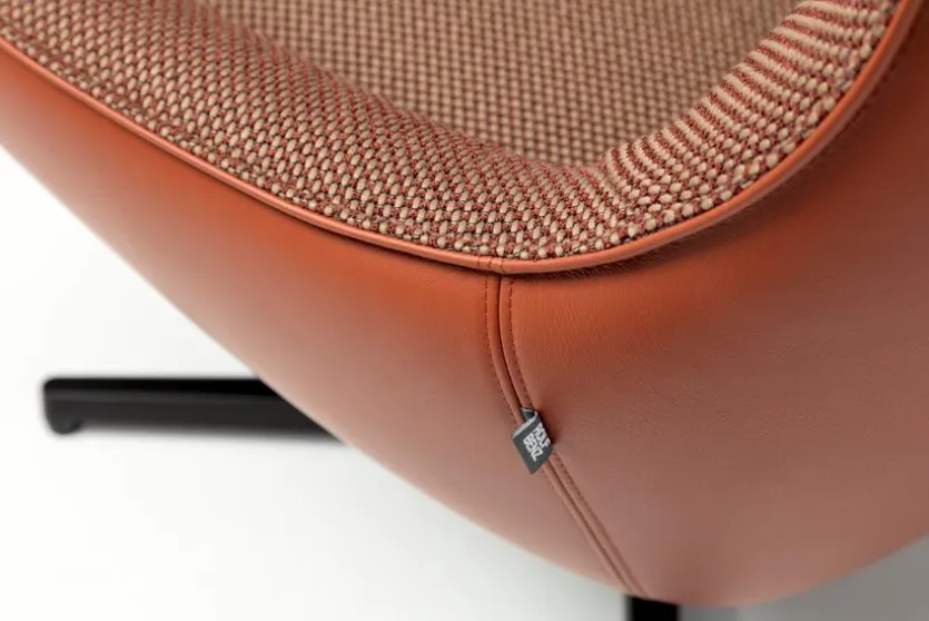 - Sitzbezug aus Stoff in rotbraun (24.514), Korpusbezug aus Leder in kupferbraun (38.112), Kreuzfuß in RAL9017 verkehrsschwarz