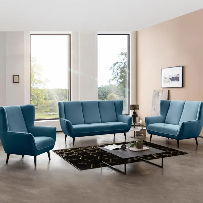 - Polsterung aus PUR-Schaum, Unterfederung durch dauerelastische Stahlwellenfedern und flexible Polstergurte