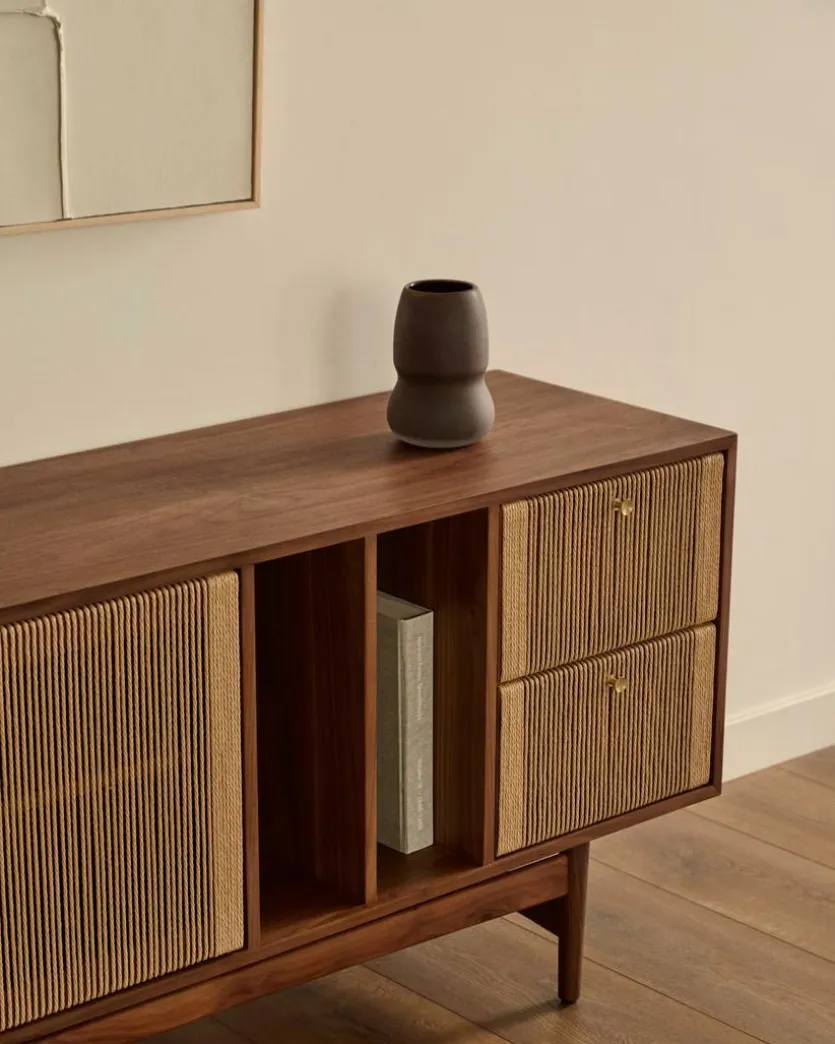 - Front aus Papierseil handgeflochten in natur, Griffe aus Messing