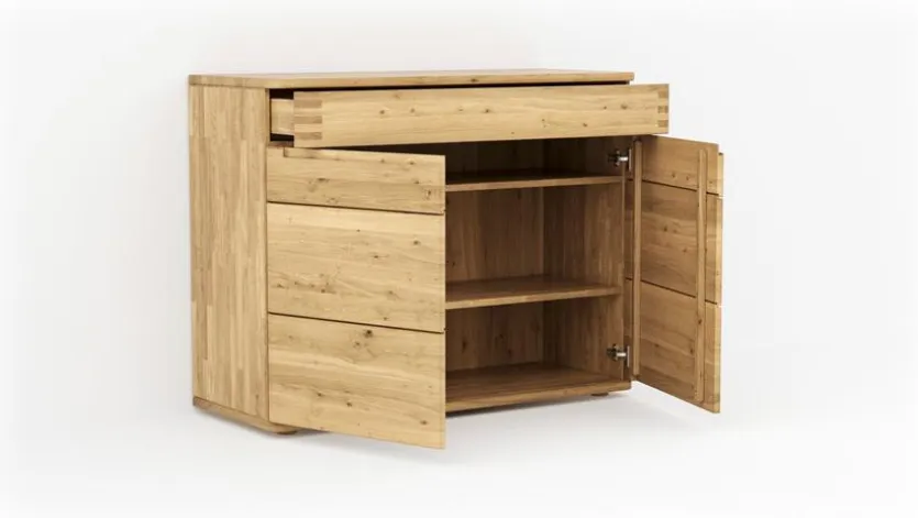 Holz, dieser wunderbare natürliche Rohstoff, begleitet Sie ein ganzes Leben lang, wenn Sie ein paar Dinge beachten. Holz und Furnier müssen sich erst an ein Raumklima gewöhnen. Vermeiden zu hohe Temperaturunterschiede, damit sich das Material nicht immer wieder verzieht. Während der ersten 6-8 Wochen sollten Sie Gegenstände nicht länger stehen lassen, um Bleichspuren zu vermeiden. Mit der Zeit dunkeln vor allem Weichholzarten wie Kiefer und Fichte nach.