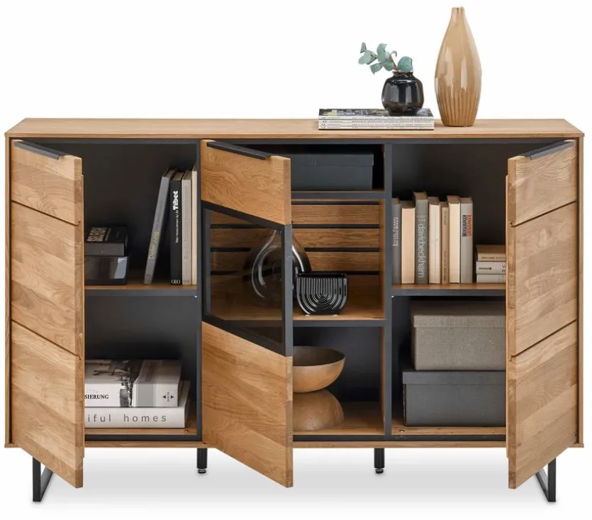 - Korpus aus Holzwerkstoff (Spanplatte) in Echtholz Eiche furniert, Front aus massiver Eiche