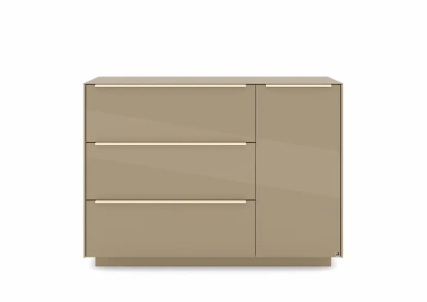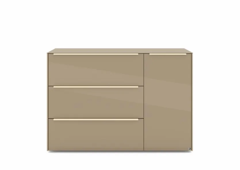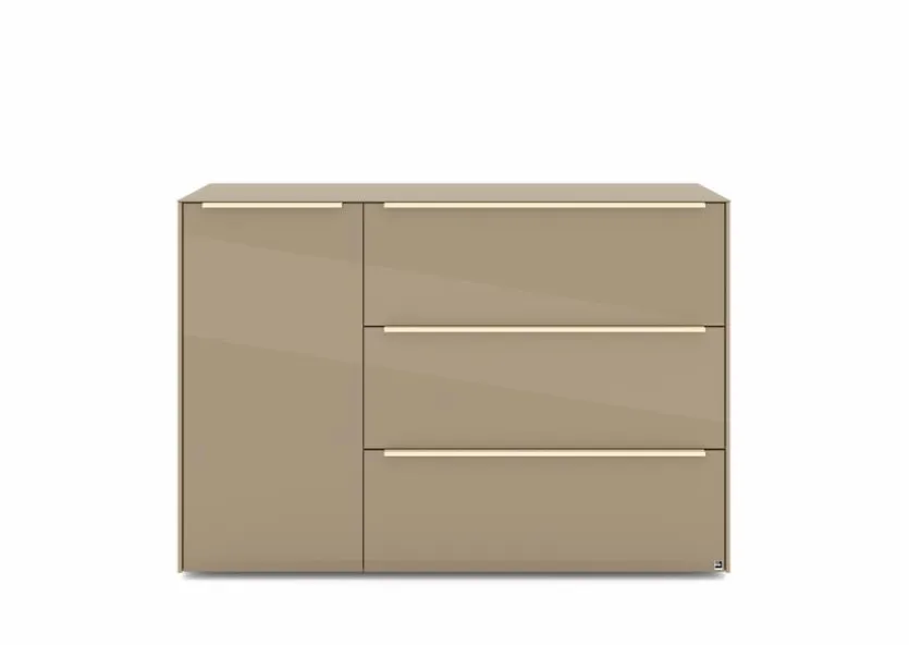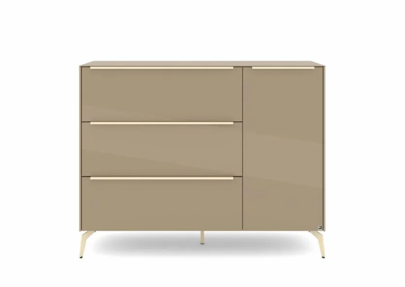 - Mit 1 Tür, 1 Klappe und 2 Schubkästen, Griffe aus Metall mit Lack in kaschmir