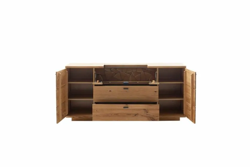 - Sichtbare Rückwand aus Scheitholz, Rückwand hinter Türen und Schubkästen aus Eiche Dekor