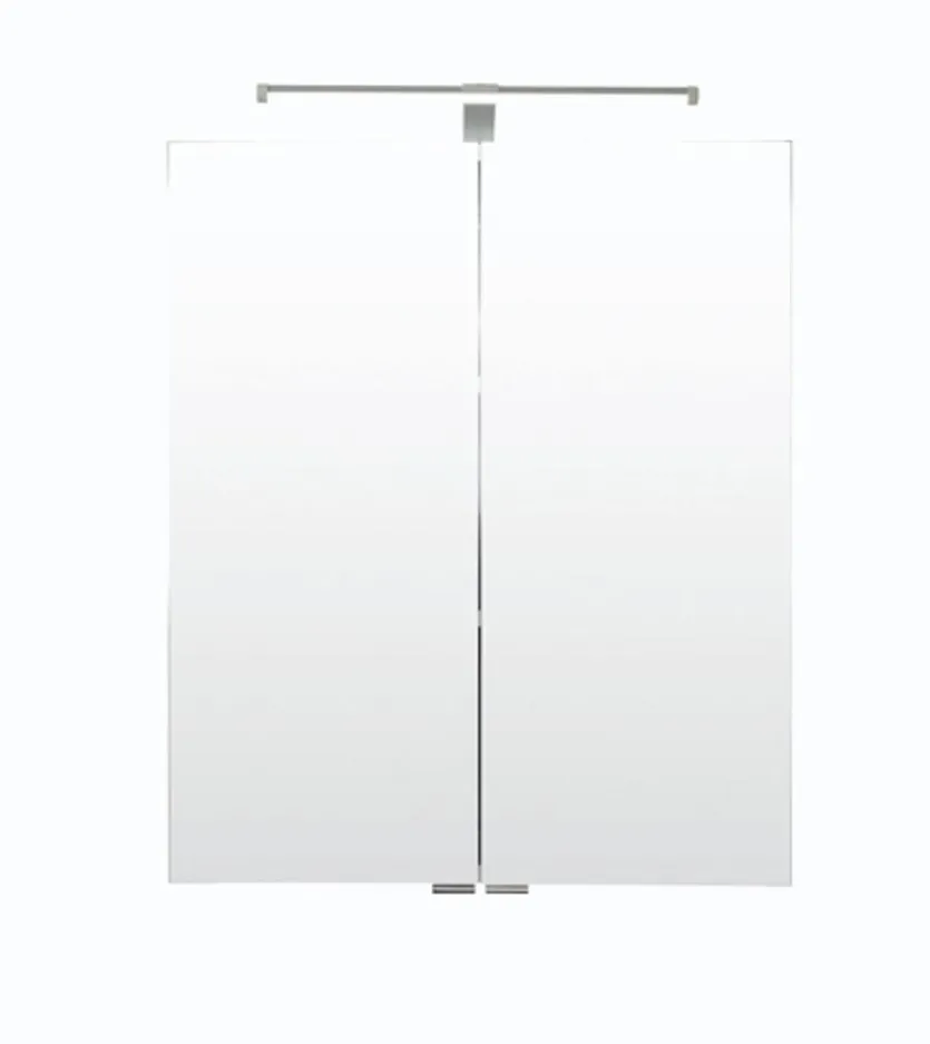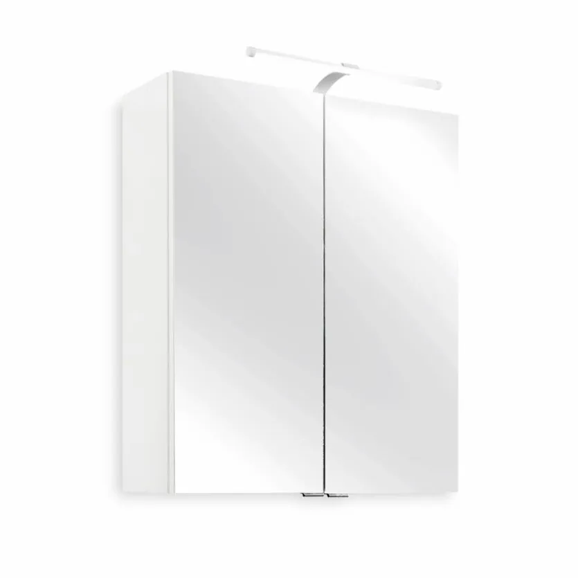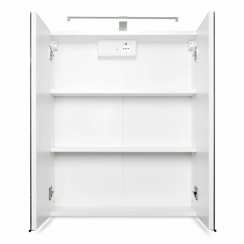Der Spiegelschrank 038.1.0001 bietet dank der zwei Holzeinlegeböden, die sich hinter den Türen mit aufeklebten Spiegeln befinden, ausreichend Platz für Make-up, Parfüm oder Zahnbürsten. Die dazugehörige LED-Leuchte spendet genug Licht zum Schminken und Frisieren. Mit der schlichten Optik lässt der Spiegelschrank 038.1.0001 viel Spielraum bezüglich der Kombination mit anderen Möbeln oder Dekoartikeln. Außerdem verfügt er über eine integrierte Steckdose.