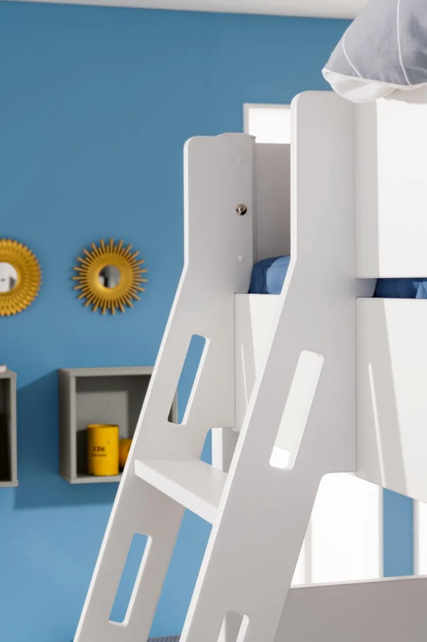 - Aus Holzwerkstoff (Spanplatte) mit kratzfester Melaminharzfolie in kreideweiß, Bettpfosten. Rutsche und Leiter aus massiver und kreideweiß lackierter Buche