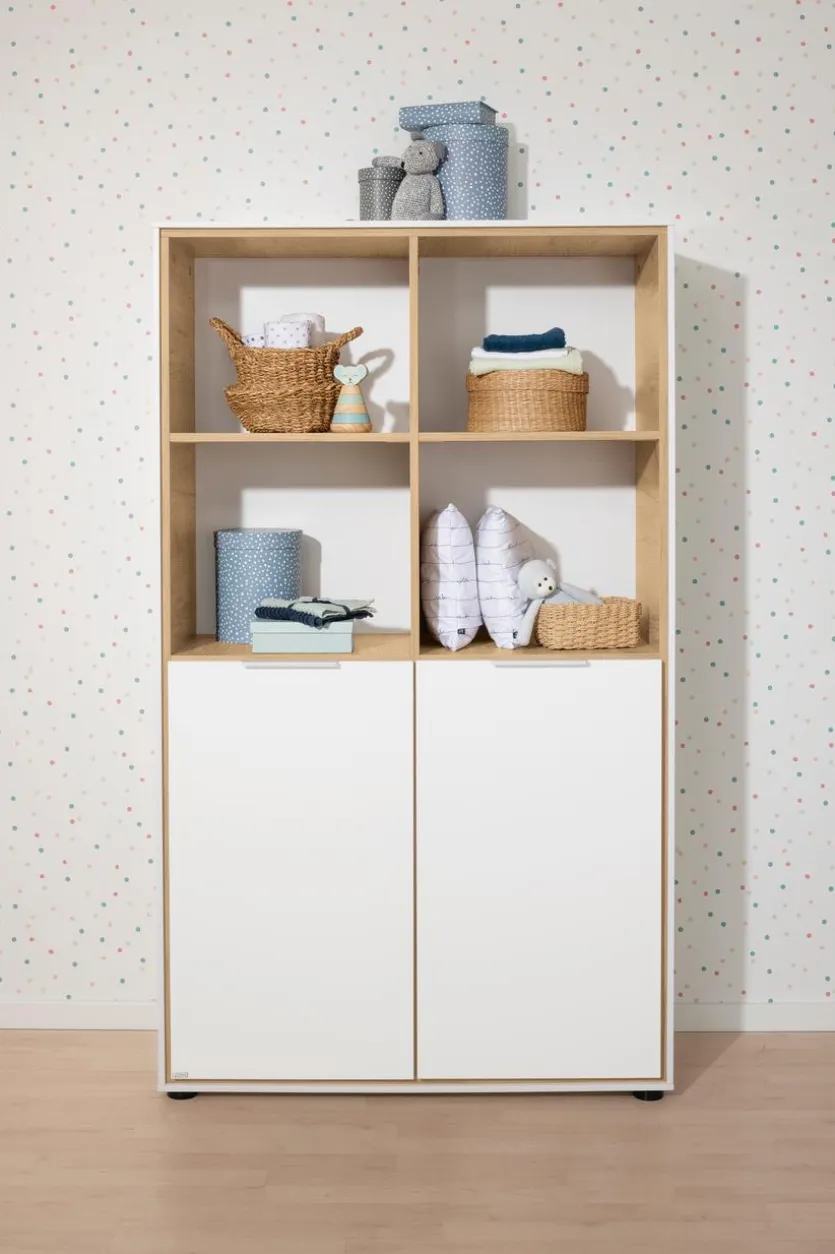 - Mit 2 Türen unten, 4 offenen Fächern oben