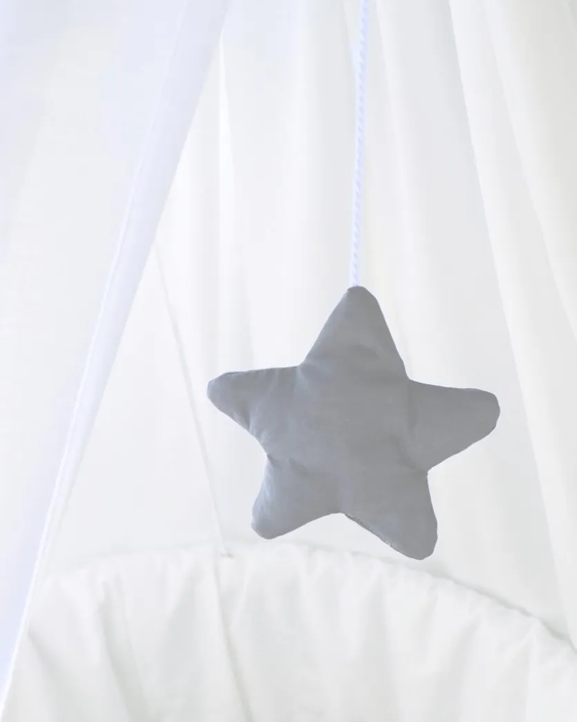 - Bezüge aus Stoff in Weiß, Mobile, Schleife, Spannbettlaken und Bordüre aus Stoff in dunkelgrau, Bezug Polsterung: 100% Baumwolle, Bezug Spannbettlaken: 100% Baumwolle, Bezug Himmel: 65% Polyester, 35% Baumwolle