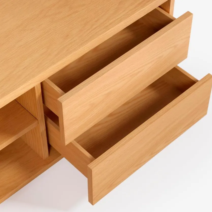 Das TV-Lowboard Abilen der Marke Kave Home bietet hinter zwei Türen und zwei Schubladen viel Stauraum für allerlei Gegenstände. Außerdem lassen sich die Schubladen des TV-Unterschranks dank versteckter Schienen und eines Push-to-open-Mechanismus problemlos öffnen und schließen. Die geradlinigen Formen machen das TV-Lowboard Abilen zu einer idealen Ergänzung für viele Einrichtungsstile.