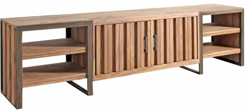 Das TV-Lowboard Adana aus dem Hause WOLFMÖBEL bringt auf eine wunderbar moderne Art und Weise urige Gemütlichkeit mit sich. Markant gemasertes Shishamholz und Fronten im Lamellendesign verleihen dem TV-Unterschrank seine charaktervolle Erscheinung. Kombinieren Sie das TV-Lowboard Adana am besten mit weiteren Typen aus diesem fantastischen Programm!